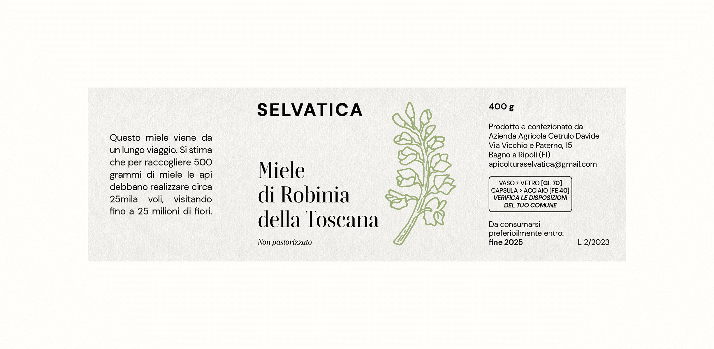 Selvatica produces honey from the rolling hills just outside Florence. Rooted in a philosophy of slow, sustainable cultivation, the brand celebrates the spontaneity of nature and the richness of local craftsmanship. The name Selvatica, meaning “wild” in Italian, inspired a visual identity full of energy and warmth, expressed through a dynamic logo, bold typography, and hand-drawn illustrations. The label system was developed to distinguish three honey varieties while maintaining a cohesive, characterful look across the range.