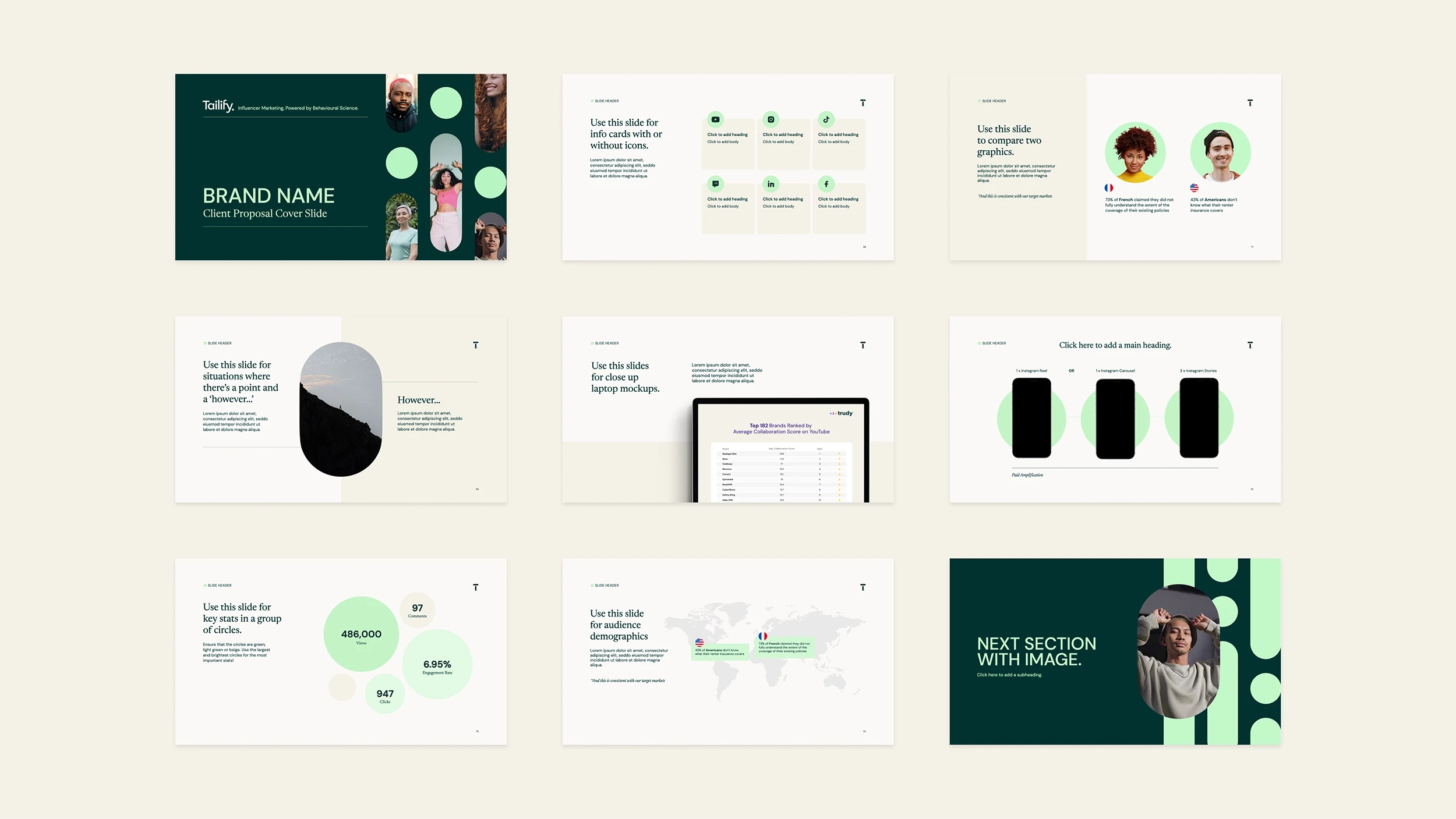 Tailify is an influencer marketing agency powered by behavioural science. I worked as their sole in-house designer evolving their brand and creating a look and feel that is memorable and quirky yet polished. I designed a brand identity, website, marketing collateral, and custom illustrations which showcase their new maturity while maintaining their cheeky and friendly approach. The central graphic motif is the ‘i’ for influence, taken from the lozenges and circles used to construct the new brand icon. The curved, geometric shapes form a pattern which reflects the connections between people in the ever-evolving creator economy. The palette has a bright, mint green for highlights and a sophisticated forest green for a more grown up feel. The neutral palette is intentionally minimal to not overshadow the work of Tailify’s own clients; however the expressive and bold palette was created to bring more zing and playfulness to the agency’s social media content and internal collateral. Leveraging the juxtaposition between grown-up and playful I paired the elegant serif Newsreader typeface with the contemporary and youthful DM Sans sans serif.